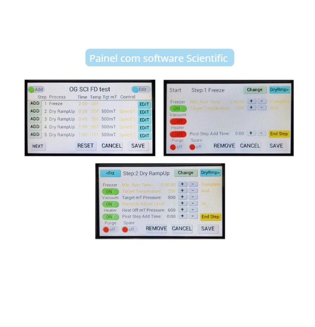 Controle da temperatura das prateleiras durante a secagem, incluindo a possibilidade de definir até 5 temperaturas diferentes, permitindo secagem em fases e em temperaturas distintas.