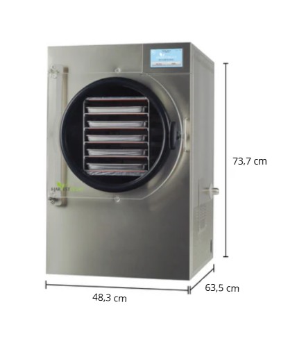 Dimensões externas do liofilizador: 48,3 cm de largura × 63,5 cm de profundidade × 73,7 cm de altura.